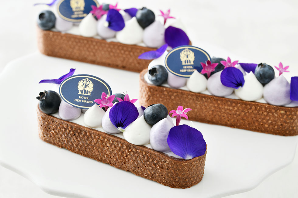 金額:1個¥864チョコレートのタルトをベースに、ブルーベリージャムとカスタードクリームを重ね、その上にはブルーベリーとフロマージュ2種のクリームを絞りました。トップに飾ったエディブルフラワーが目を引く、華やかでエレガントな期間限定のスイーツです。