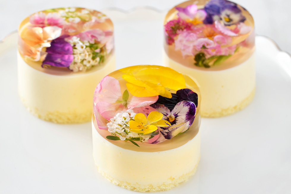 白ワインを使用した爽やかな味わいのなめらかなムースの上に、華やかな色合いのエディブルフラワーをシャンパンゼリーで閉じ込め、春から初夏にかけて咲き誇る美しい花々を表現したパティシエこだわりの一品です。