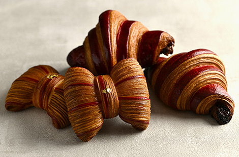 濃厚でなめらかなキャラメルガナッシュをたっぷり入れ、クロワッサン生地のサクサク食感とのハーモニーをお楽しみいただける「キャラメルリボンデニッシュ」。フランボワーズジャムとショコラを入れ、甘酸っぱさとバター香る風味をご堪能いただける「フランボワーズショコラ」。